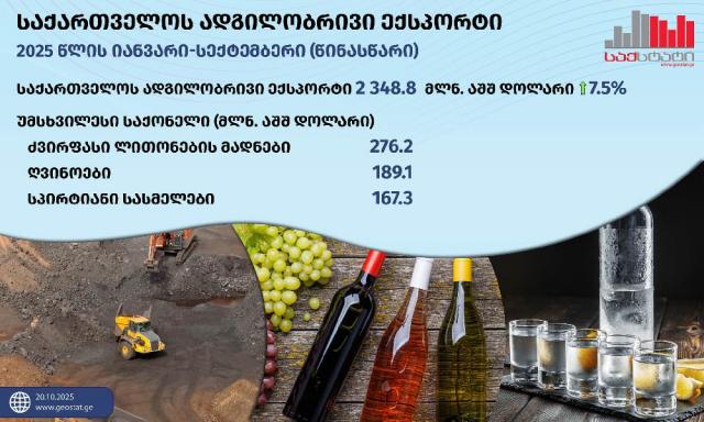 ამასთან, საქსტატის ცნობით, 2025 წლის იანვარ-სექტემბერში ადგილობრივი ექსპორტის ათეულში პირველ ადგილზე ძვირფასი ლითონების მადნები და კონცენტრატები არის წარმოდგენილი 276.2 მლნ. აშშ დოლარით, აღნიშნული სასაქონლო ჯგუფის წილი მთლიანი ადგილობრივი ექსპორტის 11.8 პროცენტს შეადგენს. მეორე ადგილზეა ყურძნის ნატურალური ღვინოები, 189.1 მლნ. აშშ დოლარით, ხოლო მესამე ადგილს იკავებს სპირტიანი სასმელები 167.3 მლნ. აშშ დოლარით.
