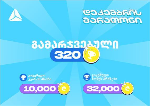 მარათონის პირველი სათამაშო კვირის შემდეგ, 320 გამარჯვებულზე ბონუს პრიზებად უკვე 32 000 ლარი გაიცა. შეგახსენებ, რომ თუ მილიონ მონეტას დააგროვებ, შენც გახდები 100 ლარის მფლობელი.