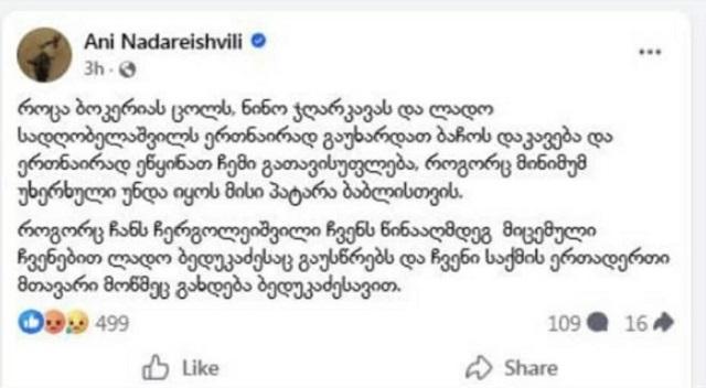 ამ პოსტს გამოეხმაურა თამარ ჩერგოლეიშვილი და ანი ნადარეიშვილს უპასუხა: