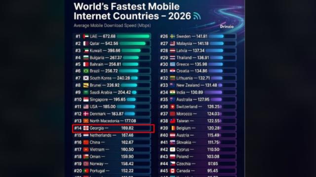 2025 წლის დეკემბრის მონაცემების თანახმად, მობილური ინტერნეტის სისწრაფით, საქართველო ისეთ ქვეყნებს უსწრებს, როგორებიცაა ნიდერლანდები, საფრანგეთი, ესპანეთი, იტალია და შვეიცარია.