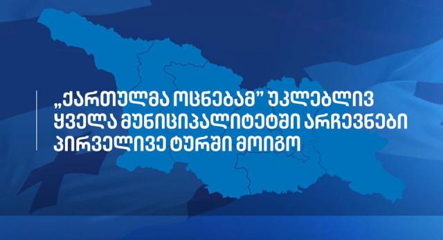 „ქართულმა ოცნებამ“ უკლებლივ ყველა მუნიციპალიტეტში არჩევნები პირველივე ტურში მოიგო, – ამის შესახებ „ქართულ ოცნებაში“ აცხადებენ.