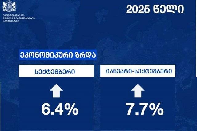 მაღალი ეკონომიკური ზრდის ტენდენცია გრძელდება - 2025 წლის იანვარ-სექტემბრის საშუალო ეკონომიკური ზრდა 7.7%-ით განისაზღვრა. პირველ კვარტალში ეკონომიკურმა ზრდამ 9.8%, მეორე კვარტალში 7.3%, მესამე კვარტალში კი 6.5% შეადგინა. რაც შეეხება ბოლო სამი თვის მაჩვენებლებს: ივლისში ეკონომიკური ზრდა 6.5%, აგვისტოში - 6.6%, ხოლო სექტემბერში 6.4%-ით განისაზღვრა, - აღნიშნულია საქართველოს ეკონომიკისა და მდგრადი განვითარების სამინისტროს მიერ გავრცელებულ ინფორმაციაში.