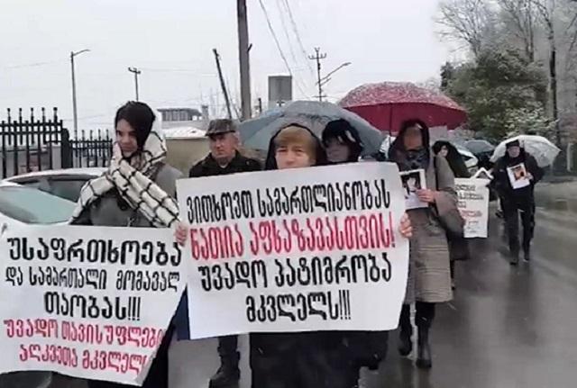 სრული სიმკაცრით დაისაჯონ მკვლელები და დანაშაულის სხვა ფიგურანტები - სასტიკად მოკლული ნათია აფხაზავას ოჯახმა ზუგდიდის სასამართლოსთან მდუმარე აქცია გამართეს. მსხვერპლის ახლობლები მოითხოვენ, რომ ბრალდებულ ნათია ხაჩატურიანს სასჯელის ზომად უვადო პატიმრობა განესაზღვროს.