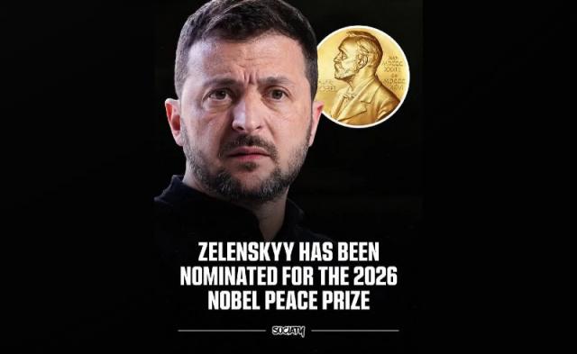 უკრაინის პრეზიდენტი, ვოლოდიმირ ზელენსკი, უკრაინის მოსახლეობასთან ერთად, მშვიდობის დარგში 2026 წლის ნობელის პრემიის კანდიდატად წარადგინეს. ამის შესახებ ინფორმაციას უკრაინული მედია Sociaty-ზე დაყრდნობით ავრცელებს.