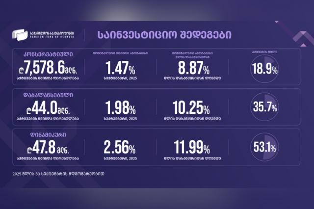 საქართველოს საპენსიო ფონდის აქტივებმა სექტემბრის ბოლოსთვის 7.7 მილიარდ ლარს, ხოლო დაგენერირებულმა ამონაგებმა - 2.0 მილიარდ ლარს გადააჭარბა