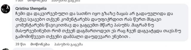 "ჩემი და დაკვირვებული და სათნო იყო, გზაზე ბაყაყს არ გადაუვლიდა და თქვე სვავებო თქვენ კომენტარებს დაუფიქრდით რას წერთ. მსგავს კომენტარებს წავიკითხავ და გაგცემთ მწარე პასუხს, მაგრამ ნუ მასურვებინებთ რომ თქვენ დაგმართოდეთ ეს რაც ჩვენ დაგვატყდა თავს. ნუ გამომიწვევთ თქვენი დამპალი დაუდევარი ენებით", - დაწერა ქრისტინა შენგელიამ.