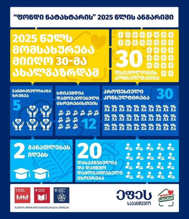 2025 წელს „ფონდი ნატახტარის“ საქმიანობის შედეგად, მომსახურება მიიღო 30-მა ახალგაზრდამ. მნიშვნელოვანია, რომ მიმდინარე წლის ბენეფიციართა 66% დასაქმებულია, კერძოდ, მათგან 10 სტაბილურად მუშაობს, 1 სტუდენტია და ნახევარ განაკვეთზეა დასაქმებული, 3 პერიოდულად მუშაობს მომსახურების სფეროში, 5 არასტაბილურად არის დასაქმებული, 1 გაემგზავრა საზღვარგარეთ, სადაც აგრძელებს სწავლას და მუშაობას; 12-მა ახალგაზრდამ დამოუკიდებელი ცხოვრების მხარდაჭერის მიზნით სტიპენდია მიიღო. პროექტის ყველა მონაწილეს უტარდებოდა ფსიქოკონსულტირება და საჭიროების შემთხვევაში, პროფესიული კ ონსულტირება.
