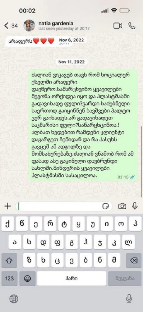 მივედით საღამოს და ვარდების მაგივრად მინდვრის ყვავილებით იყო მაგიდა მორთული (ფოტოზე ჩანს) და ალაგ-ალაგ ხელოვნური ყვავილები იყო გამოყენებული. ამას რომ თავი დავანებოთ, ისე ციოდა გაიყინნენ ბავშვები. მივწერე მის დამხმარეს, პასუხიც არ გამცა ისე მომატყუეს თვალი არ დაახამხამეს პირველად ვნახე ასეთი ცბიერი ადამიანი მერე ეკრანზე რომ ვხედავდი, ვფიქრობდი, რამე ხომ არ მეშლება, მე ხომ არ ვარ დამნაშავე-მეთქი იმდენად სხვა ადამიანს თამაშობდა.