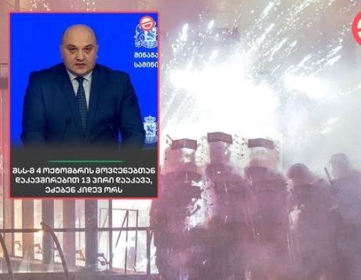 ცოტა ხნის წინ გამართულ ბრიფინგზე შს მინისტრის სანქცირებულმა მოადგილემ, ალექსანდრე დარახველიძემ, თქვა, რომ შსს-მ 4 ოქტომბრის მოვლენებთან დაკავშირებით 13 პირი დააკავა, ეძებენ კიდევ ორს.