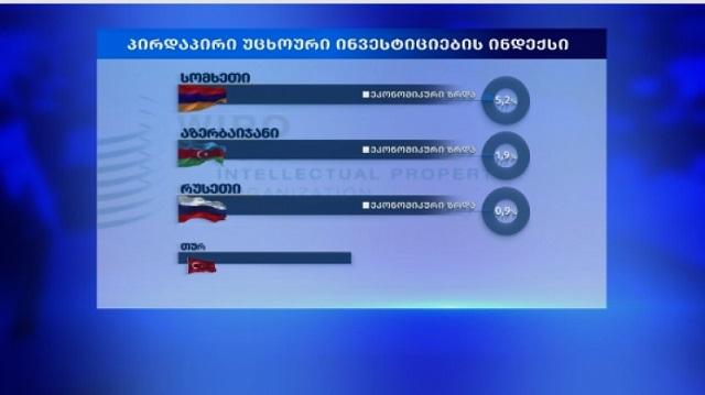 საქართველოს პოზიტიური მაჩვენებელი აქვს პირდაპირი უცხოური ინვესტიციების ინდექსის მიხედვითაც. შეფასების 100%-იანი სისტემით 60,23 % და მსოფლიოს მასშტაბით მე-17 ადგილი. ევროპაში - საუკეთესო ხუთეული. უცხოური ინვესტიციების ინდექსი ინტელექტუალური საკუთრების მსოფლიო ორგანიზაციამ გამოაქვეყნა.
