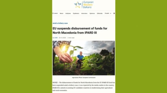 ადგილობრივი მედიის ცნობით, ჩრდილოეთ მაკედონიისთვის ევროკავშირის IPARD III ფონდიდან თანხების გამოყოფა შეჩერებულია ქრთამის აღების საქმესთან დაკავშირებული სკანდალის გამო. IPARD III პროგრამის მიზანია ევროკავშირის კანდიდატი ქვეყნების დახმარება სოფლის მეურნეობის სფეროსა და მის მოდერნიზაციაში.
