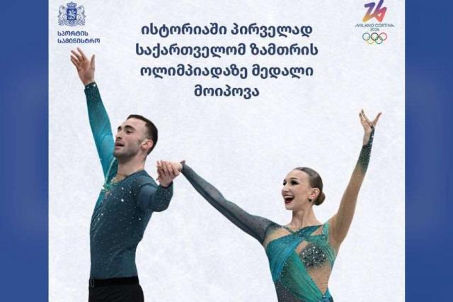 მილანსა და კორტინაში მიმდინარე ზამთრის ოლიმპიადაზე, ფიგურულ ციგურაობაში, სპორტულ წყვილებში, საქართველოს ნაკრების წევრებმა, ანასტასია მეტელკინამ და ლუკა ბერულავამ თავისუფალი პროგრამა წარმოადგინეს – ორი პროგრამის ჯამში ქართულმა წყვილმა 221.75 ქულა დააგროვა და ვერცხლის მედალი მოიპოვა, რაც ისტორიაში ზამთრის ოლიმპიადაზე მოპოვებული პირველი მედალია. ადგილები ასე განაწილდა: