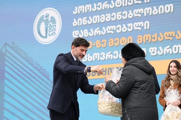 ბინების სიმბოლური გასაღებები მოქალაქეებს დედაქალაქის მერმა კახა კალაძემ გადასცა და მათ ახალმოსახლეობა მიულოცა.