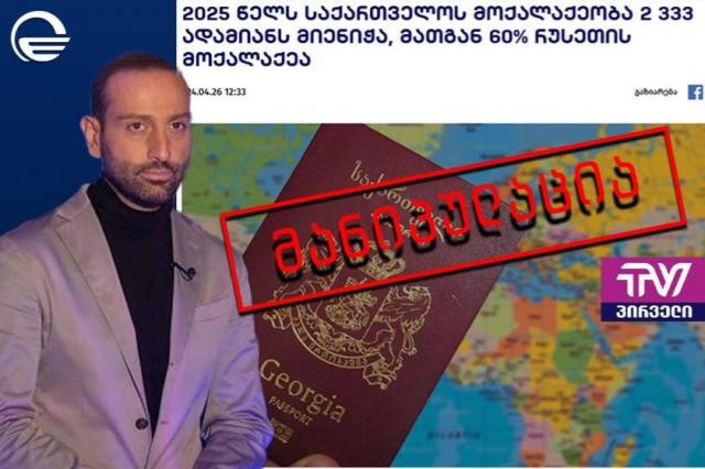 ოპოზიციური მედიის მანიპულაცია: ტელეკომპანია „ტვ პირველი“ BPN-ზე დაყრდნობით ავრცელებს 2025 წელს საქართველოს მოქალაქოების მინიჭებასთან დაკავშირებით ინფორმაციას და წერს, რომ გასულ წელს, საქართველოს მოქალაქეობა 2 333 ადამიანს მიენიჭა, რომელთაგან 60% რუსეთის მოქალაქეა.